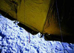 |  recouvre de neige pour éviter que le vent ne s'infiltre sous la tente, ce qui serait