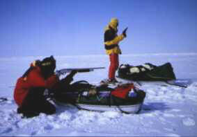 tâches: un équipier pour le pistolet lance-fusées, l'autre prêt à tirer si l'animal charge.